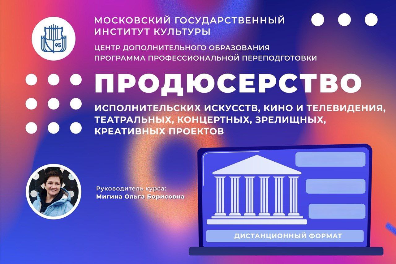 Московский государственный институт культуры (МГИК) объявляет набор на программу профессиональной переподготовки «Продюсирование исполнительских искусств». Программа разработана для специалистов, стремящихся получить системные знания и практические навыки в области продюсирования, управления творческими проектами и производства событий в сфере культуры.